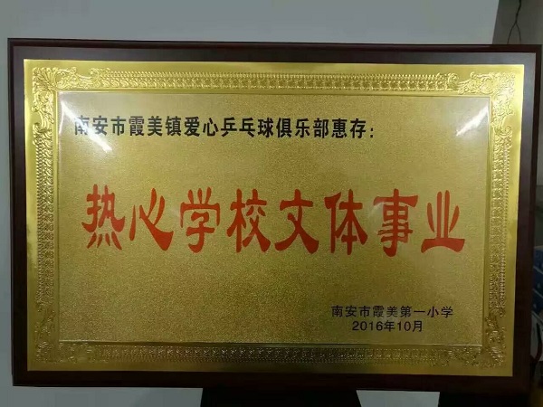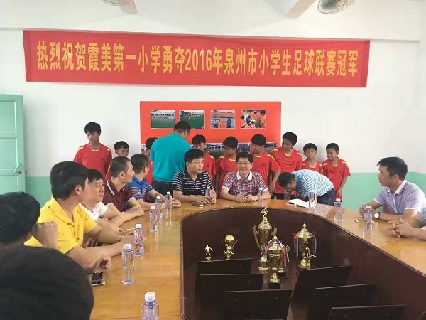 2016年10月18日,霞美镇政府,派出所,劲威电子,霞美乒协,霞美乒协慈善基金会秘书长、霞美乒协常务理事、精诺达电子科技有限公司总经理陈文圳先生和企业家们一同到霞美第一小学,鼓励他们这次的泉州市足球赛“放飞梦想杯“冠军,为教育事业献上一份爱心。