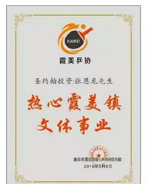 2016年6月8-9日,南安市霞美乒乓球协会端午节举行“圣约翰杯”乒乓球单打赛。